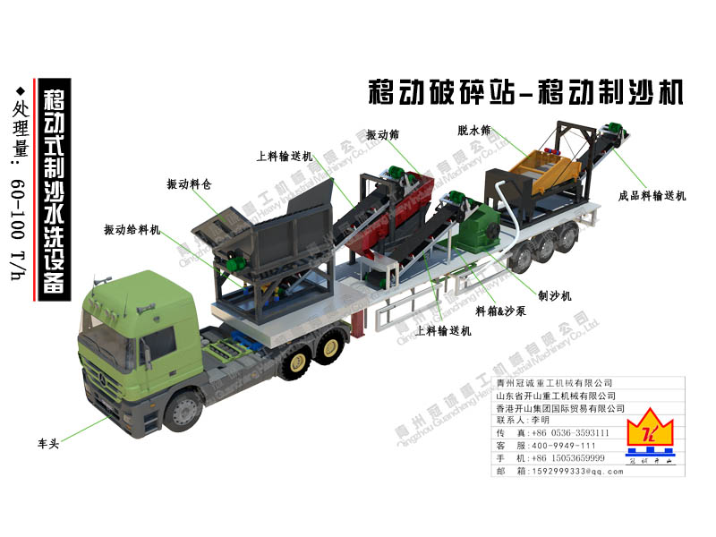 本套移動破碎站為移動式制沙水洗設(shè)備,處理量為每小時60-100噸,本移動破碎站是青州冠誠重工機械有限公司獨立設(shè)計制作而成,直接采用17.5米半掛車底盤改裝制作,其優(yōu)勢如下: