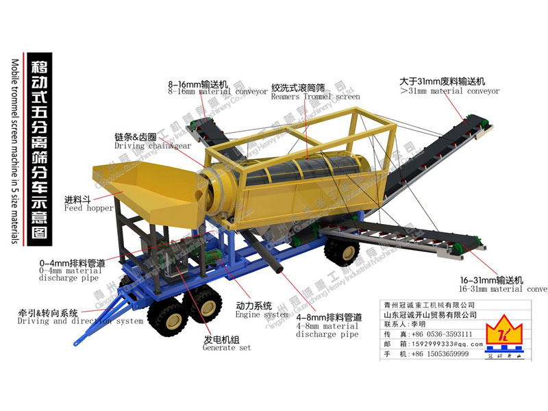 移動式五分離篩分設備,發(fā)電機組集成在底盤上,附帶牽引&轉向系統,可以使用牽引車輛輕松移動至工作場地;其中篩分系統使用了新型核心技術的絞洗式滾筒篩,其優(yōu)勢如下: